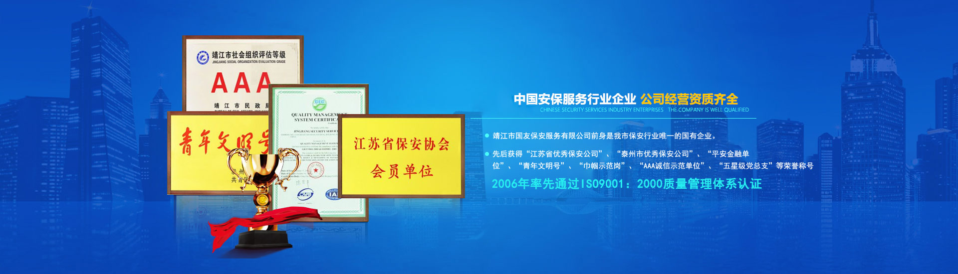 靖江市國(guó)友保安服務(wù)有限公司前身為靖江市保安服務(wù)總公司,成立于1988年12月,是我市保安行業(yè)唯一的國(guó)有企業(yè)。